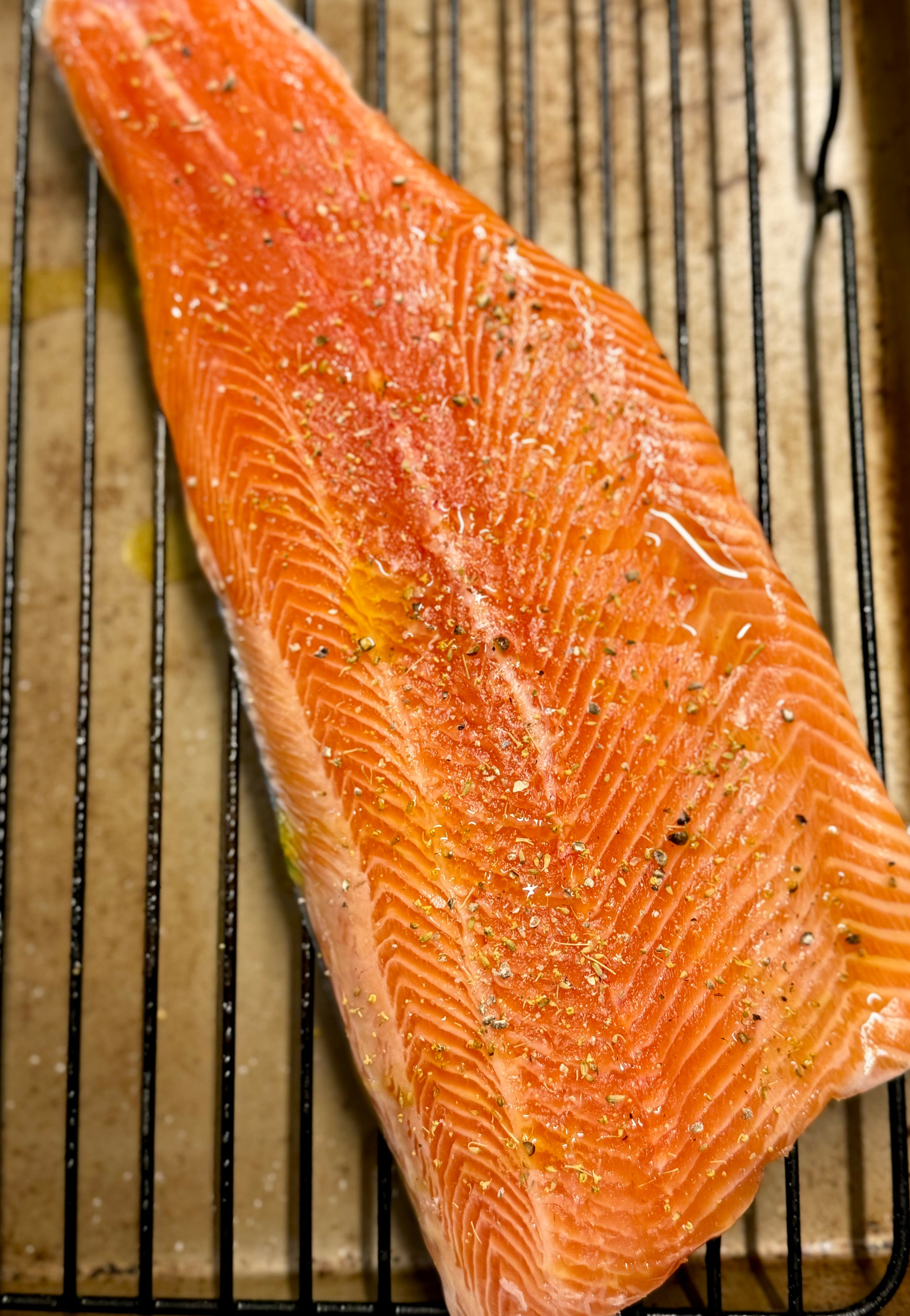 Heat the oven to 425F. Pat the fillet dry. Season lightly with salt and pepper on both sides. Place the fillet on a small baking sheet with a wire rack to elevate the fish. Season with a small sprinkle of fennel pollen, if using. Drizzle very lightly with olive oil.