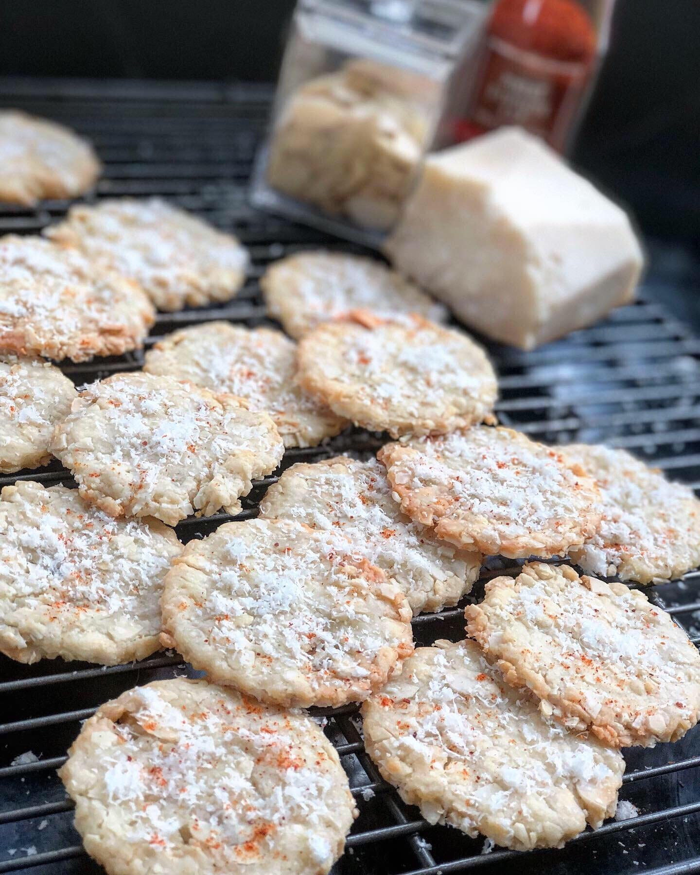 Bake for 7 minutes or until pale golden. Remove immediately and place on a wire rack. Sprinkle with extra Parmesan and cayenne while still warm.
