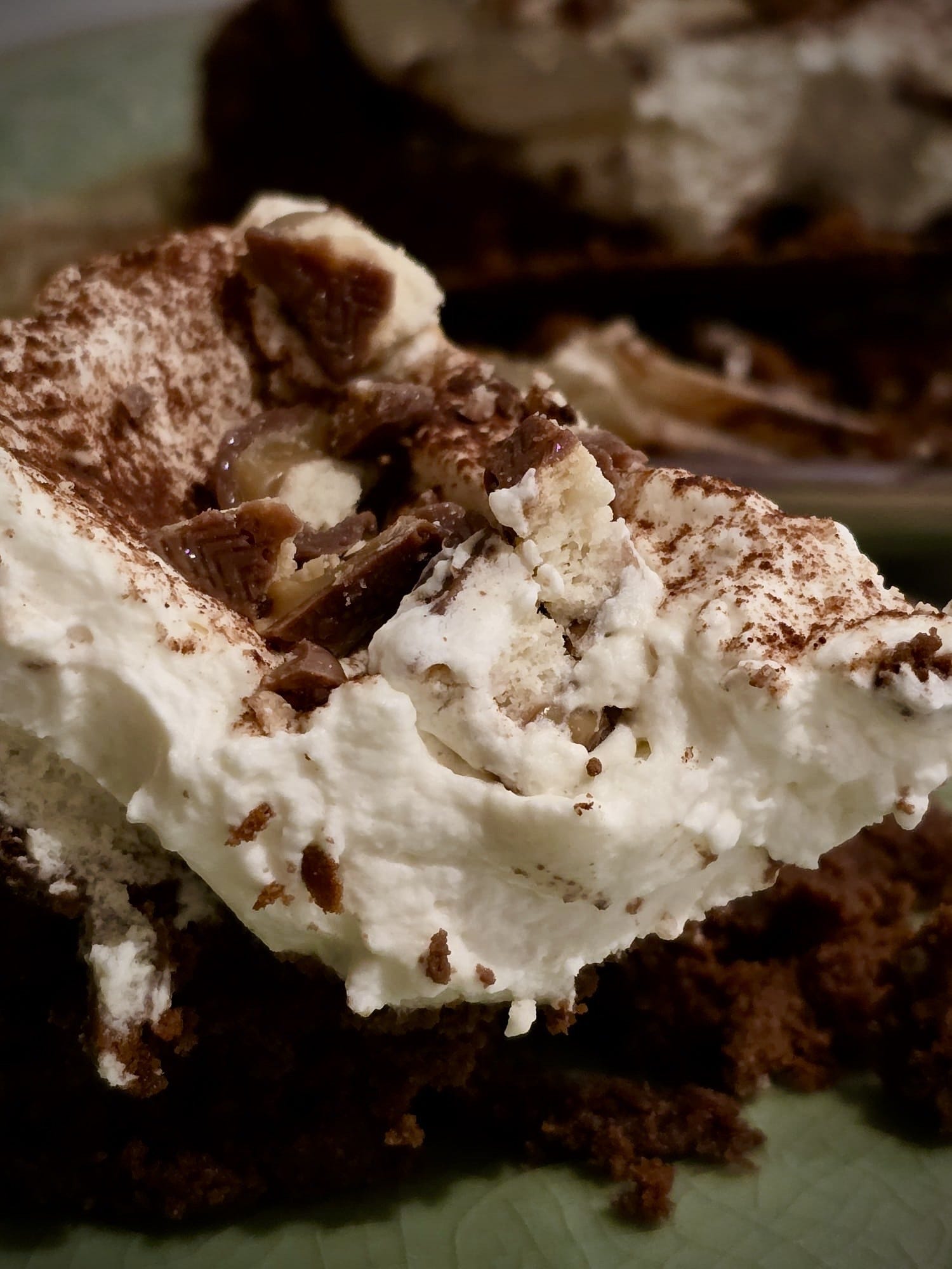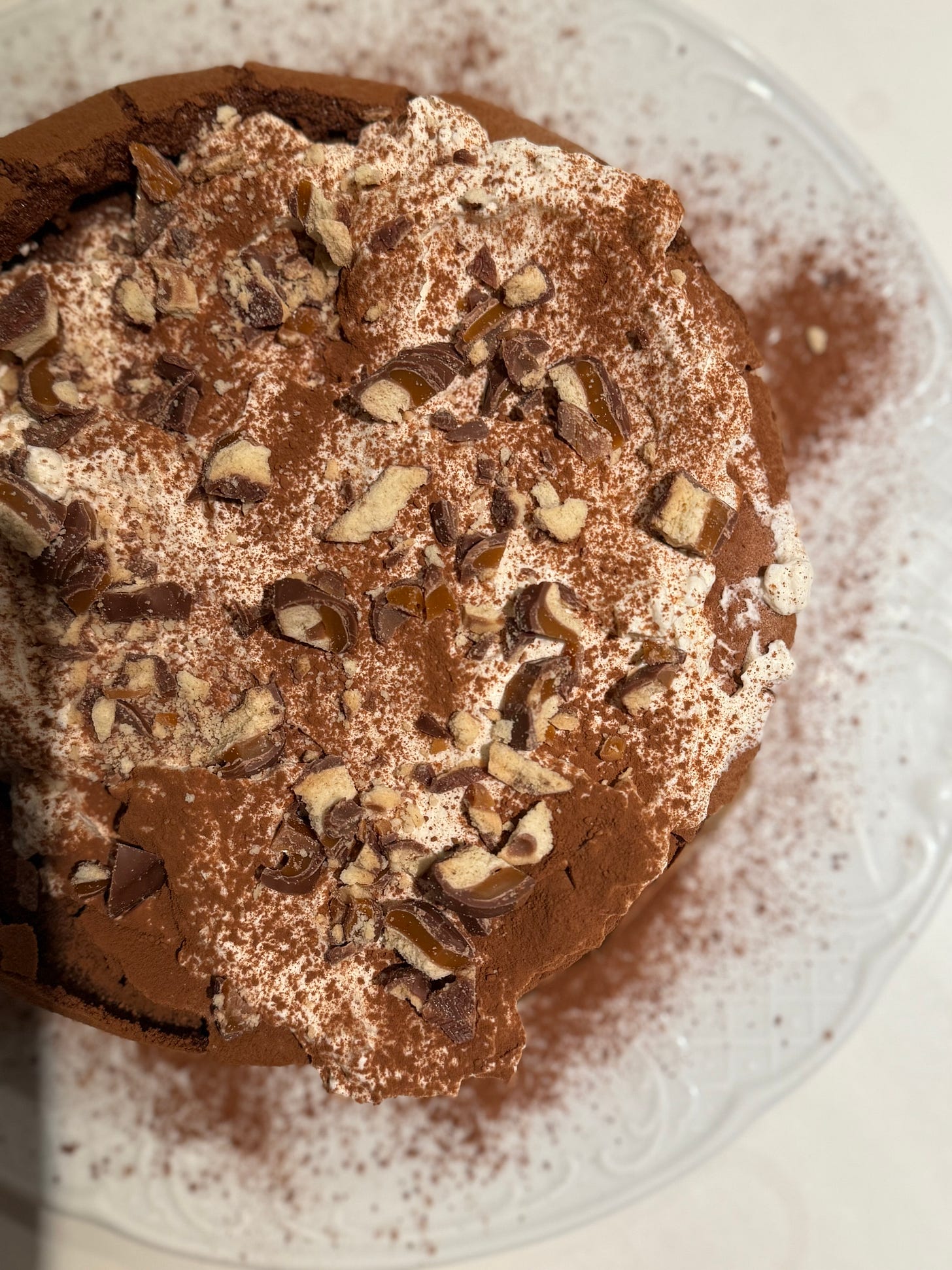 To finish: unsweetened cocoa powder and/or bittersweet chocolate shavings. For a decadent and fun addition, add chopped Skor, Heath or your favourite chocolate bar. Necessity being the mother of invention, I used Twix bars here when Skor wasn’t to be found.