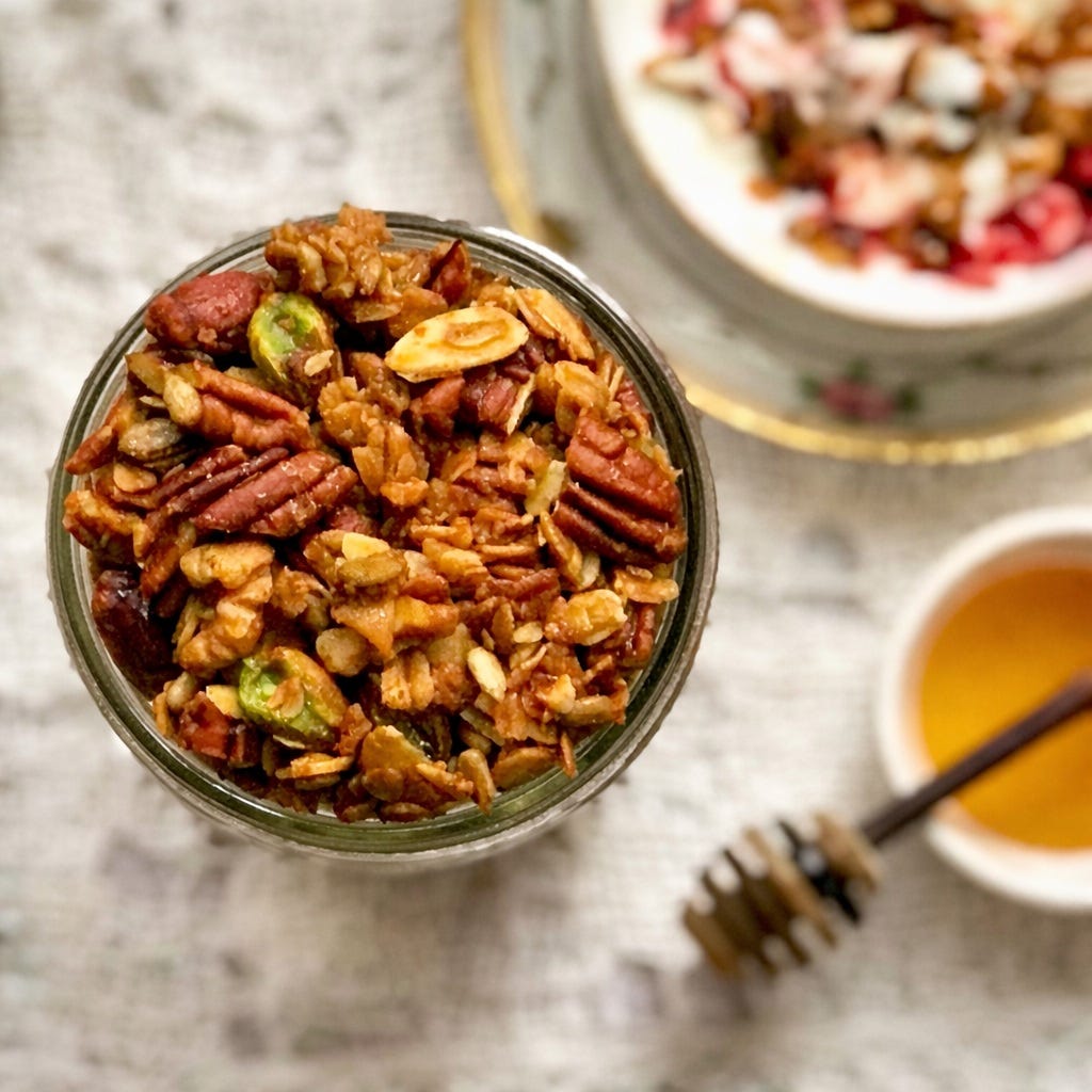 Forget Jackson and Kellogg. The genesis of this particular granola is from Fortnum and Mason, or rather the absolutely smashing cookbook that Tom Parker Bowles wrote about F+M in 2016. The beauty of granola is its absolute flexibility. Don’t like pecans? Add more almonds. Love raisins? Stir them in at the end so they don’t dry out while baking. The possibilities are endless, which is the root of originality.