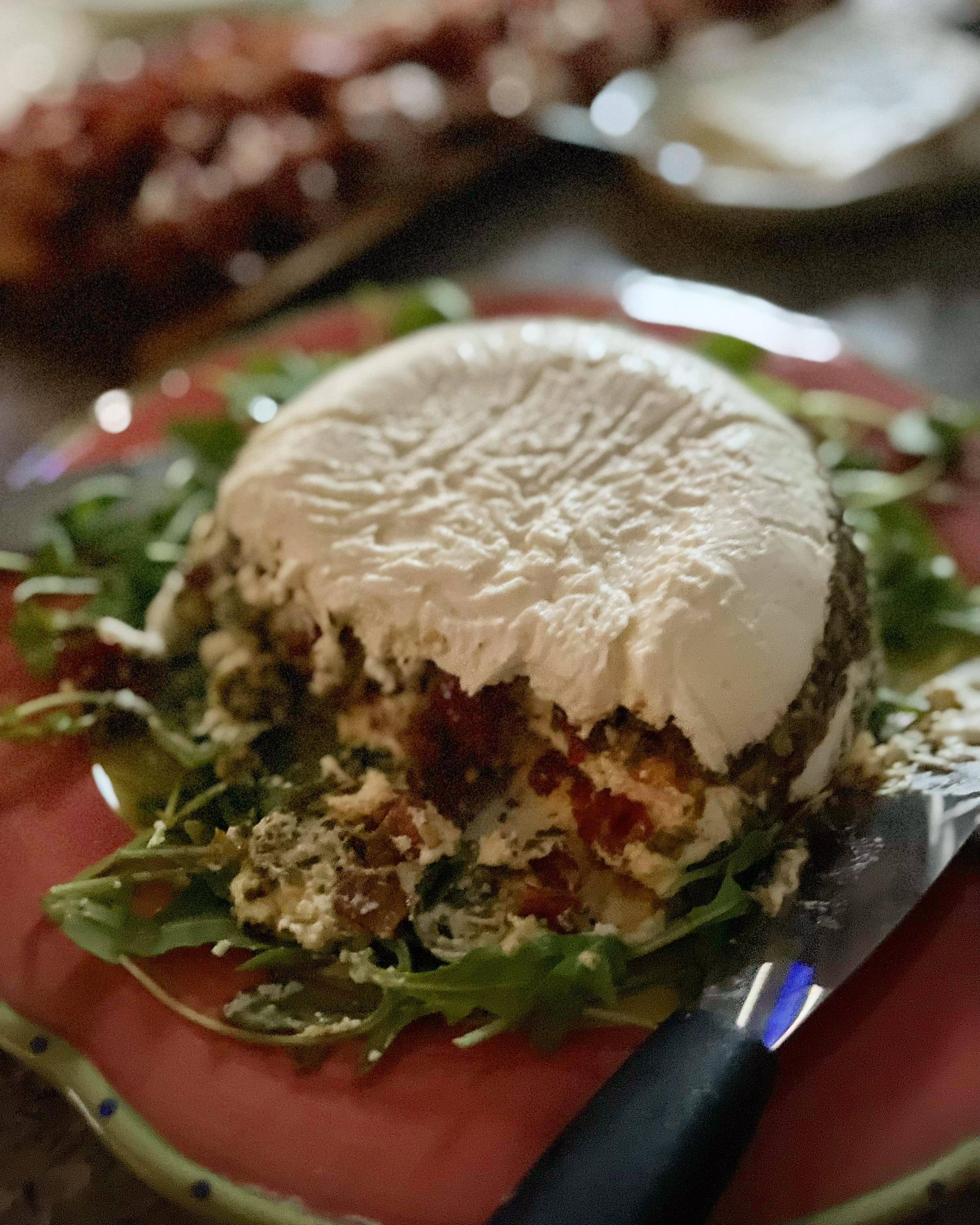 This appetizer torta is super simple and spectacularly good. Usually made with a combination of goat cheese, pesto and sun dried tomatoes, the use of mascarpone gives a lovely lightness and taste to the dish. Best of all it’s a make ahead breeze - perfect when you have much to catch up on and a fire to rebuild.