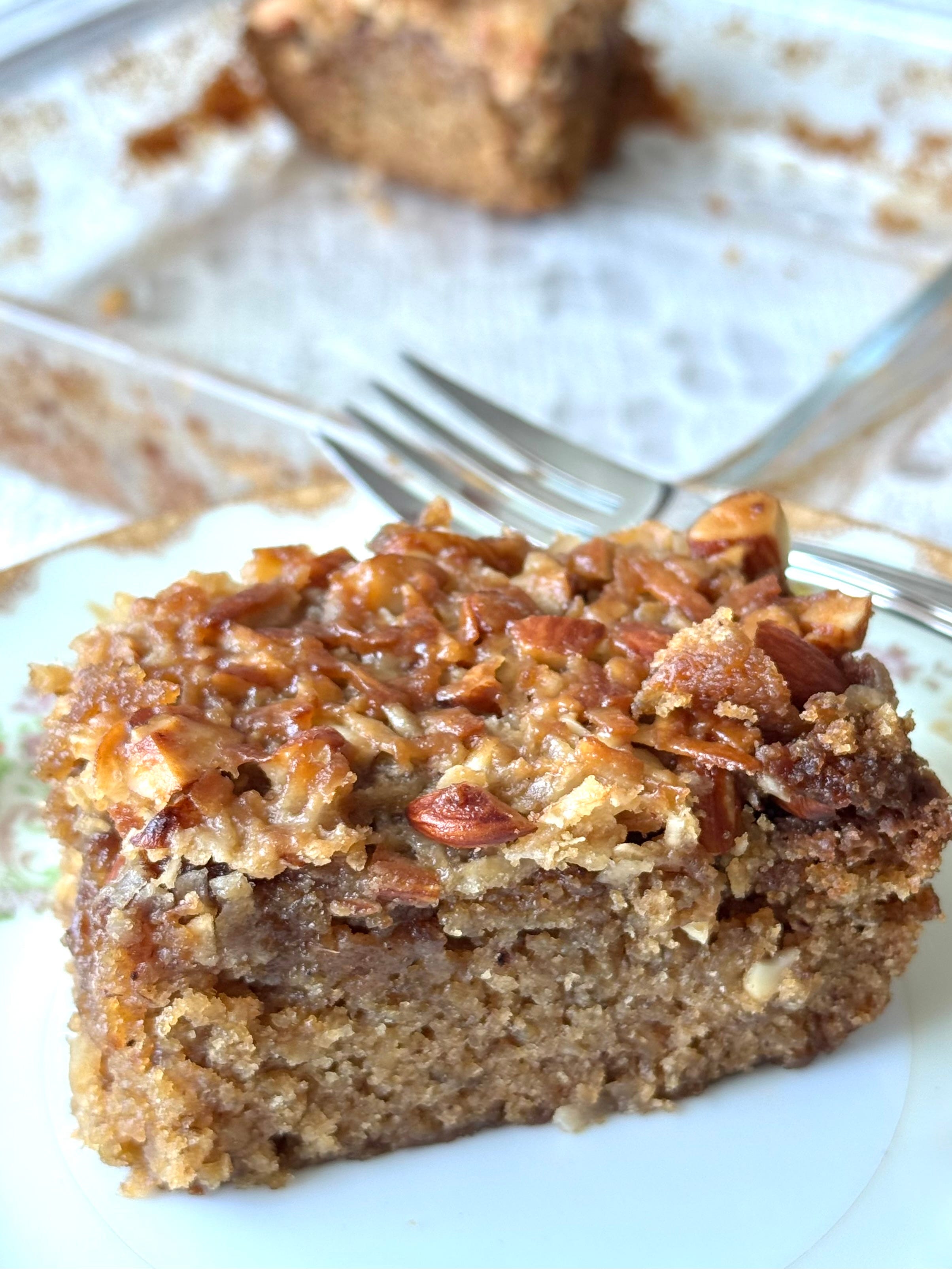 Turn the batter into a buttered 9 × 9″ pan, lined with parchment paper at the bottom. Bake at 350°F for 40 to 50 minutes, or until the cake springs back to the touch. If the cake is browning too quickly, cover with aluminum foil and continue baking until done.