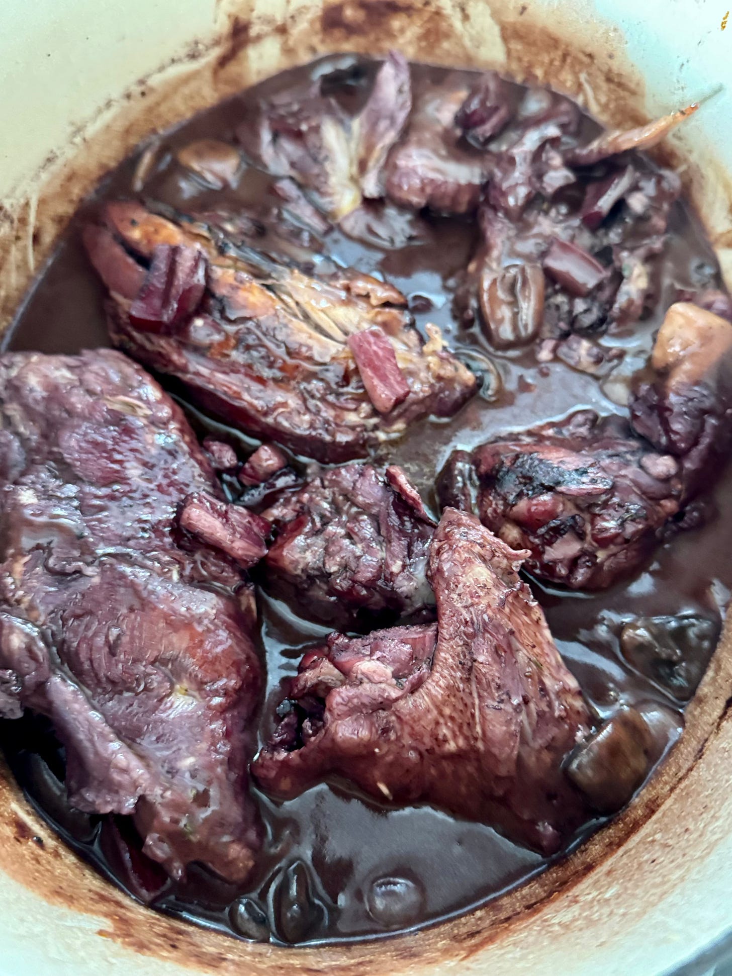 3 cups dry red wine: a Burgundy or Côtes du Rhône that you’ll also want to serve with the meal