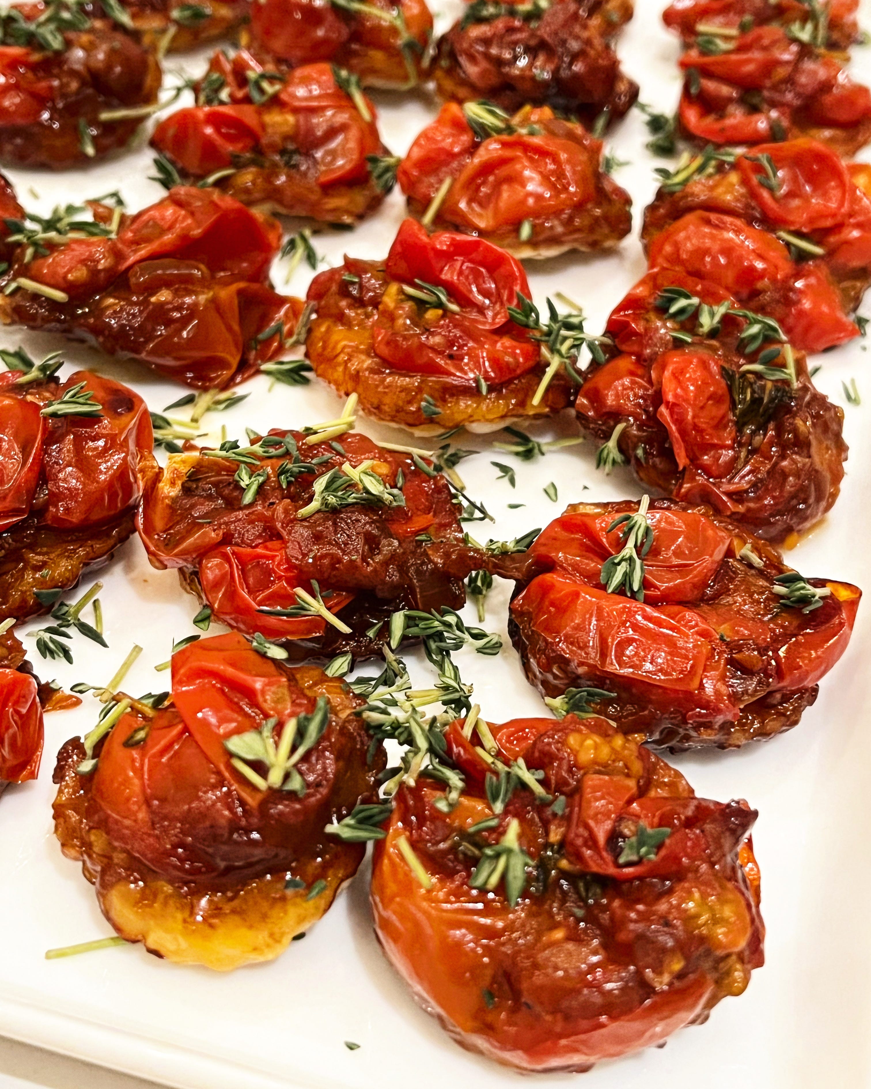 Cherry tomatoes vary greatly in water content. In step 2, you may find that the tomatoes release a lot of liquid, and aren’t caramelizing. If that’s the case, use a small ladle to scoop out some of the liquid, and continue cooking. Reserve the flavourful liquid, and chill for a fabulous vinaigrette.