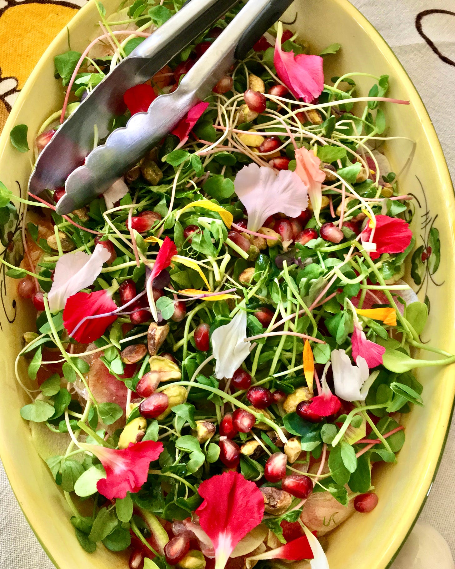 Distribute the pistachios, pomegranate seeds and nasturtiums on the salad. Add a final slick of olive oil and serve.