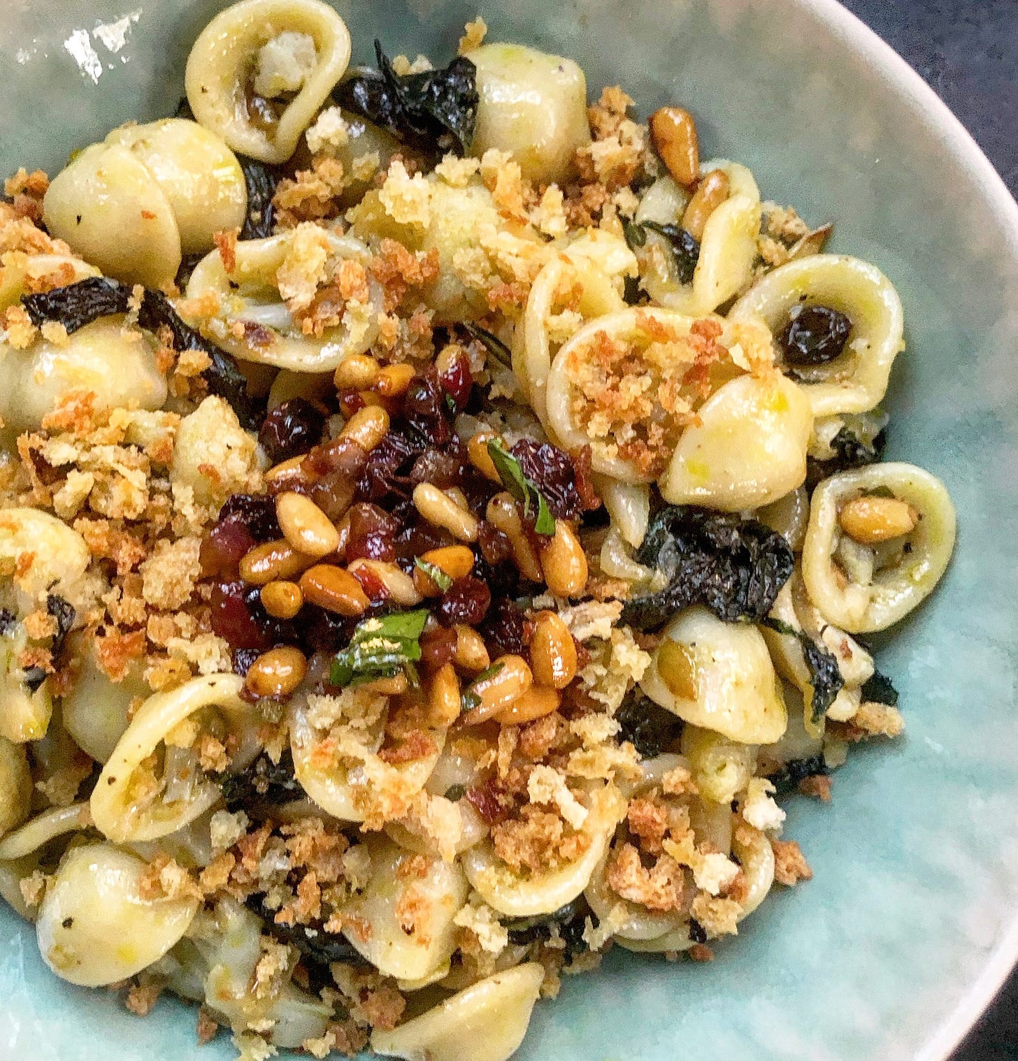 Orrechiette with cauliflower, cavolo nero, currants and pine nuts