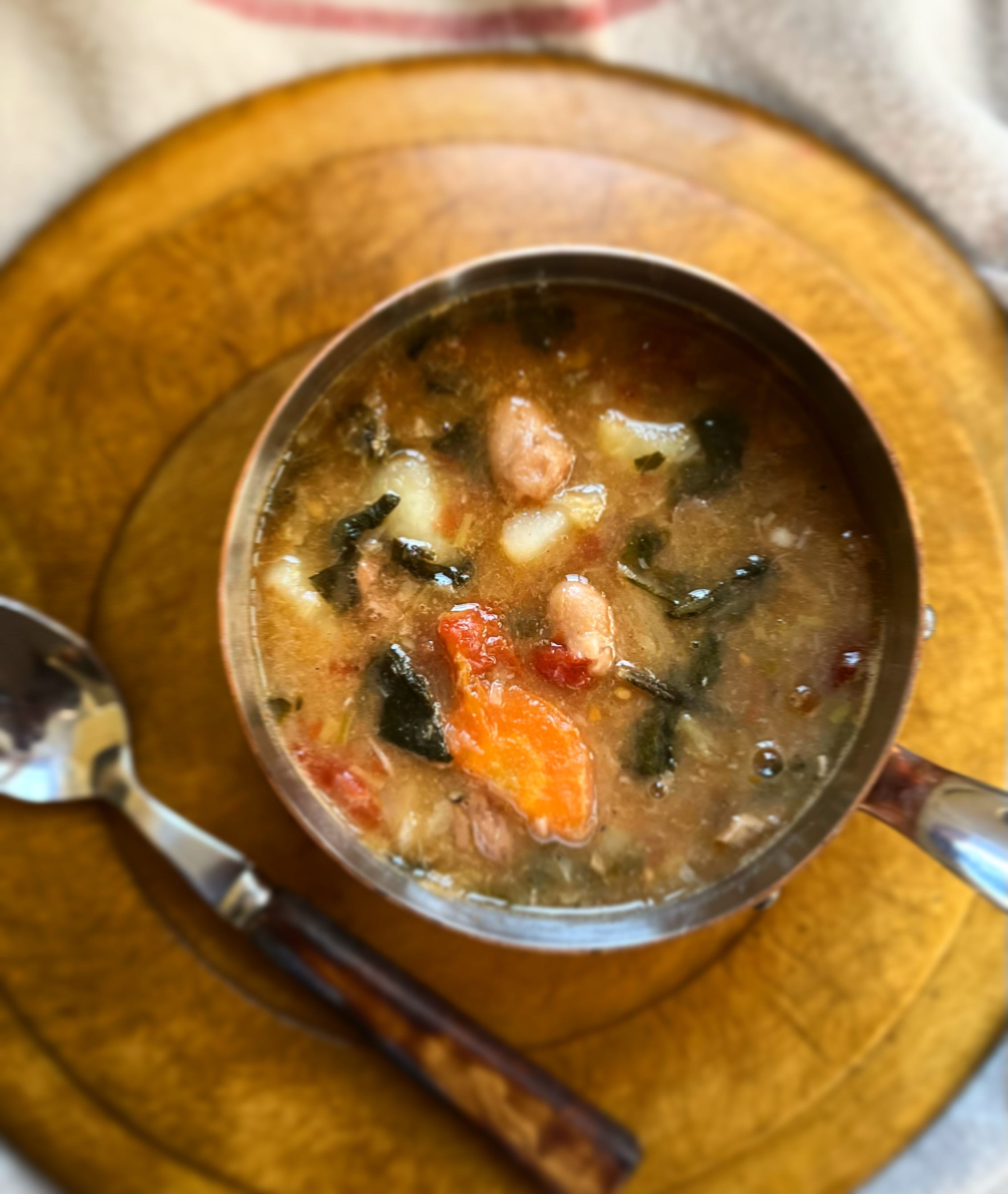 Last week I talked about the beauty of bringing dried beans to life and promised to share more recipes that use beans and their delicious liquor. To save time, of course you can use canned beans instead. Either way, this warming, filling soup will make plenty for more than one meal. It’s something you’ll look forward to eating again and again.