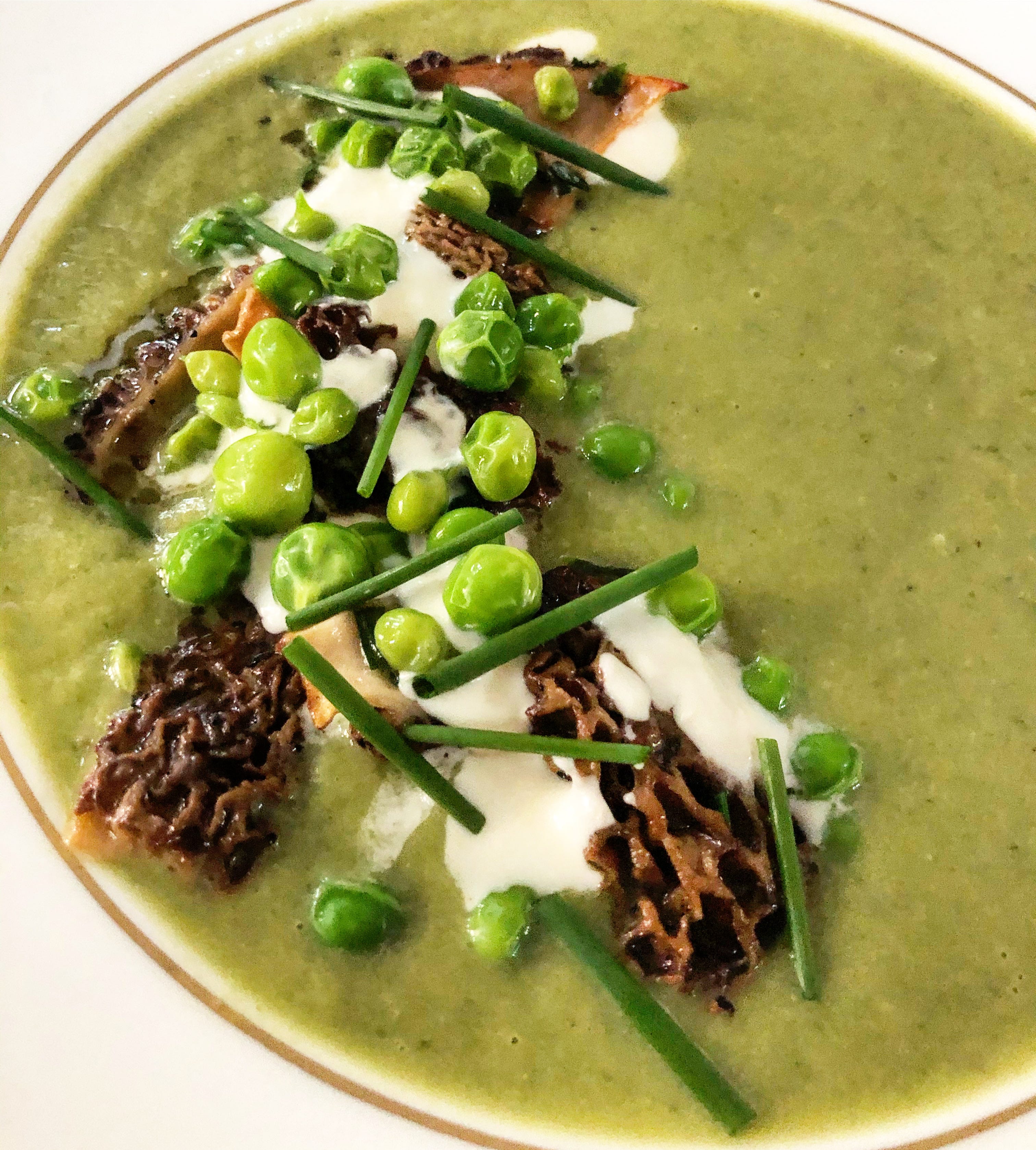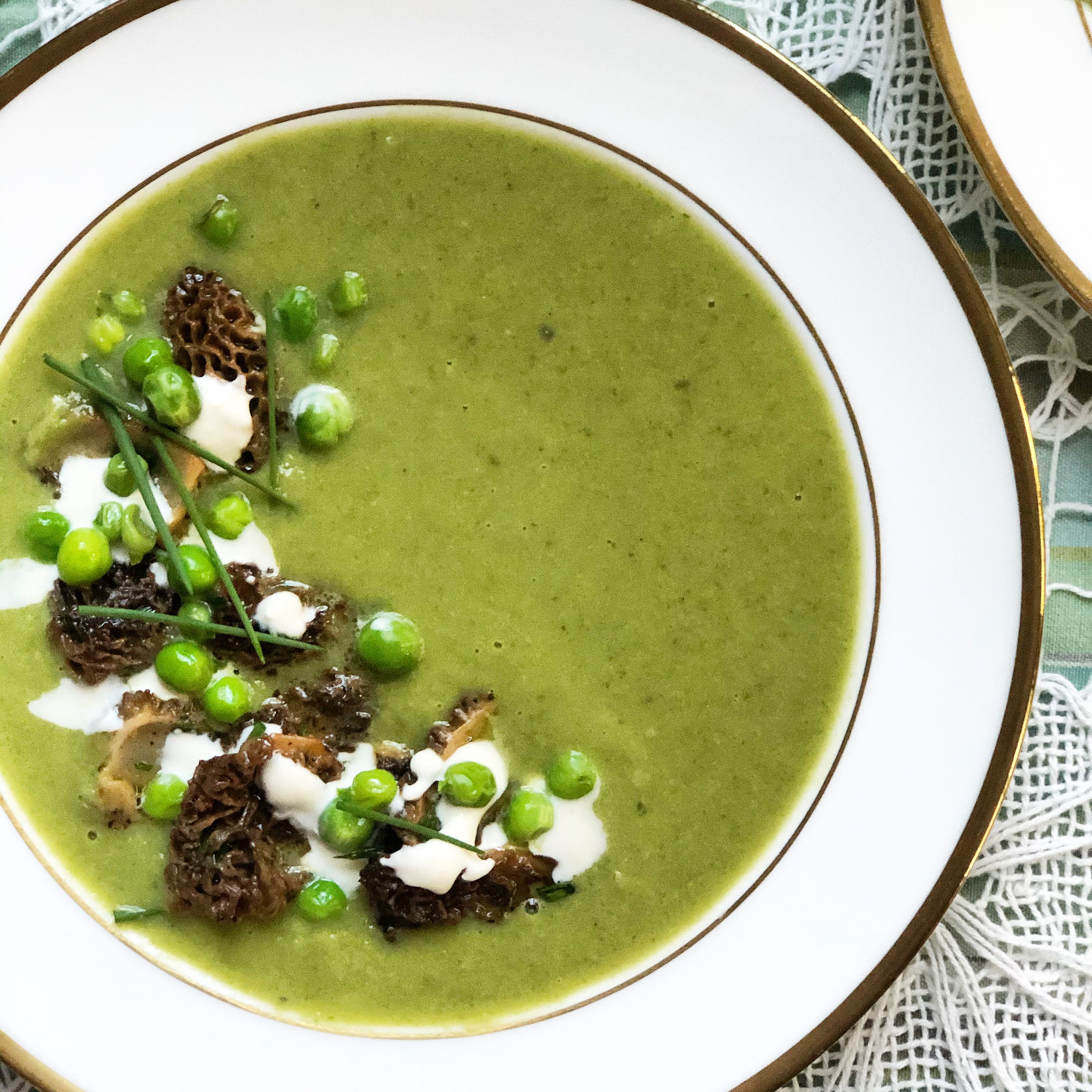 To serve, top each bowl of soup with morels, a dollop of lemon crème fraiche, and sprinkling of peas, if using.