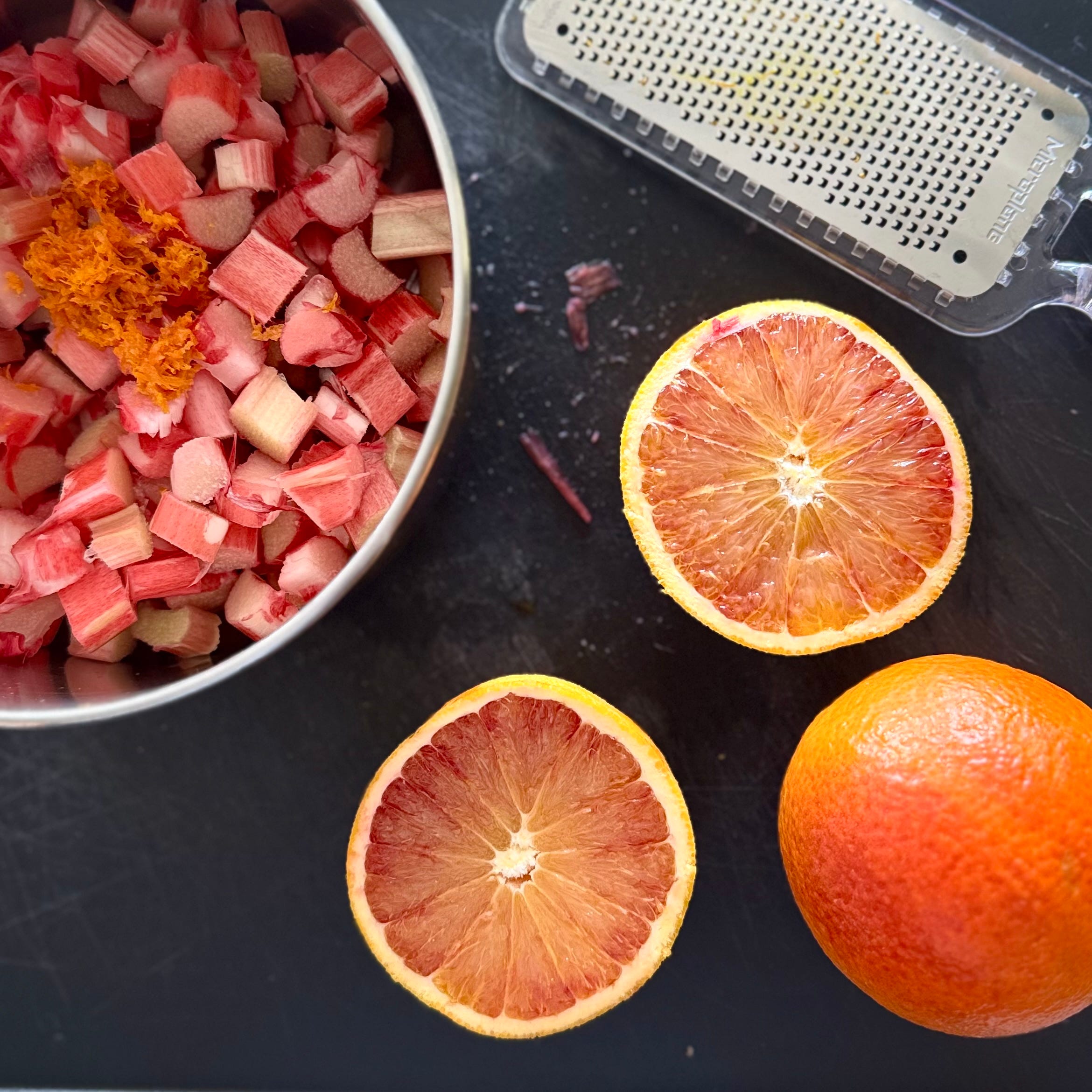 Combine chopped rhubarb, blood orange zest and juice, blanched peel, sugar, lemon juice, and salt in a saucepan. Let sit for 10–15 minutes to macerate.