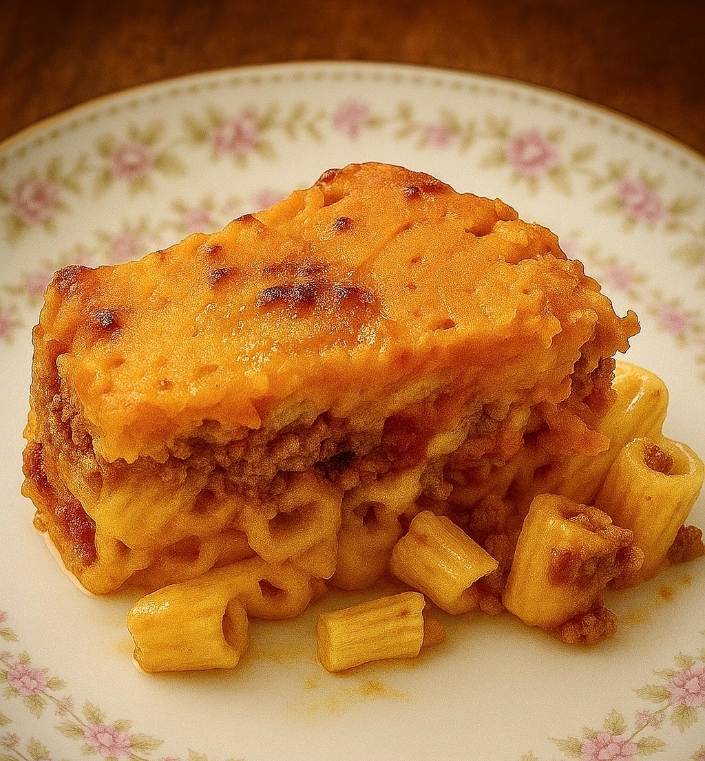 Traditional pastitsio is a layered Greek baked pasta made with long hollow noodles, a spiced beef-and-tomato layer, with a thick, egg-enriched béchamel poured over the top. Ellen’s version takes its cues from the classic and heads in a lighter, more modern direction. Instead of the usual beef-and-tomato base, it leans on ground lamb with a broader, more assertive spice profile and subs out roasted squash for the topping, which brings both sweetness and depth.