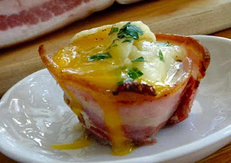 Duck eggs in pancetta cups with porcini mushrooms and cheese