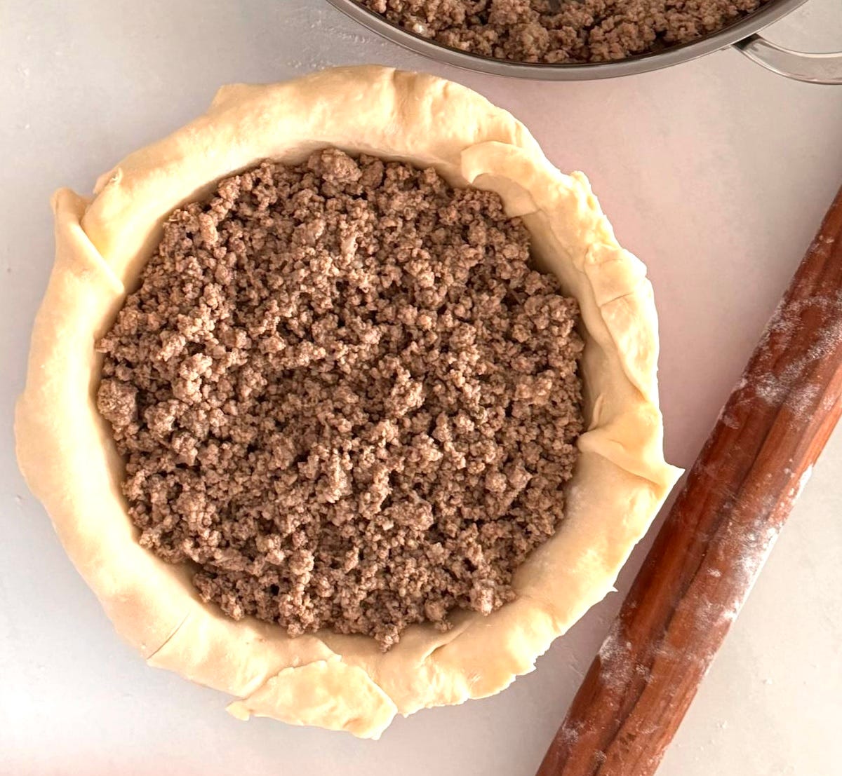 Fill the prebaked bottom crust with the meat filling. Roll out the top crust, cover the meat filling, and seal, trim and flute the crust. Prick with a fork or create a vent hole and brush the pie top with the egg wash.