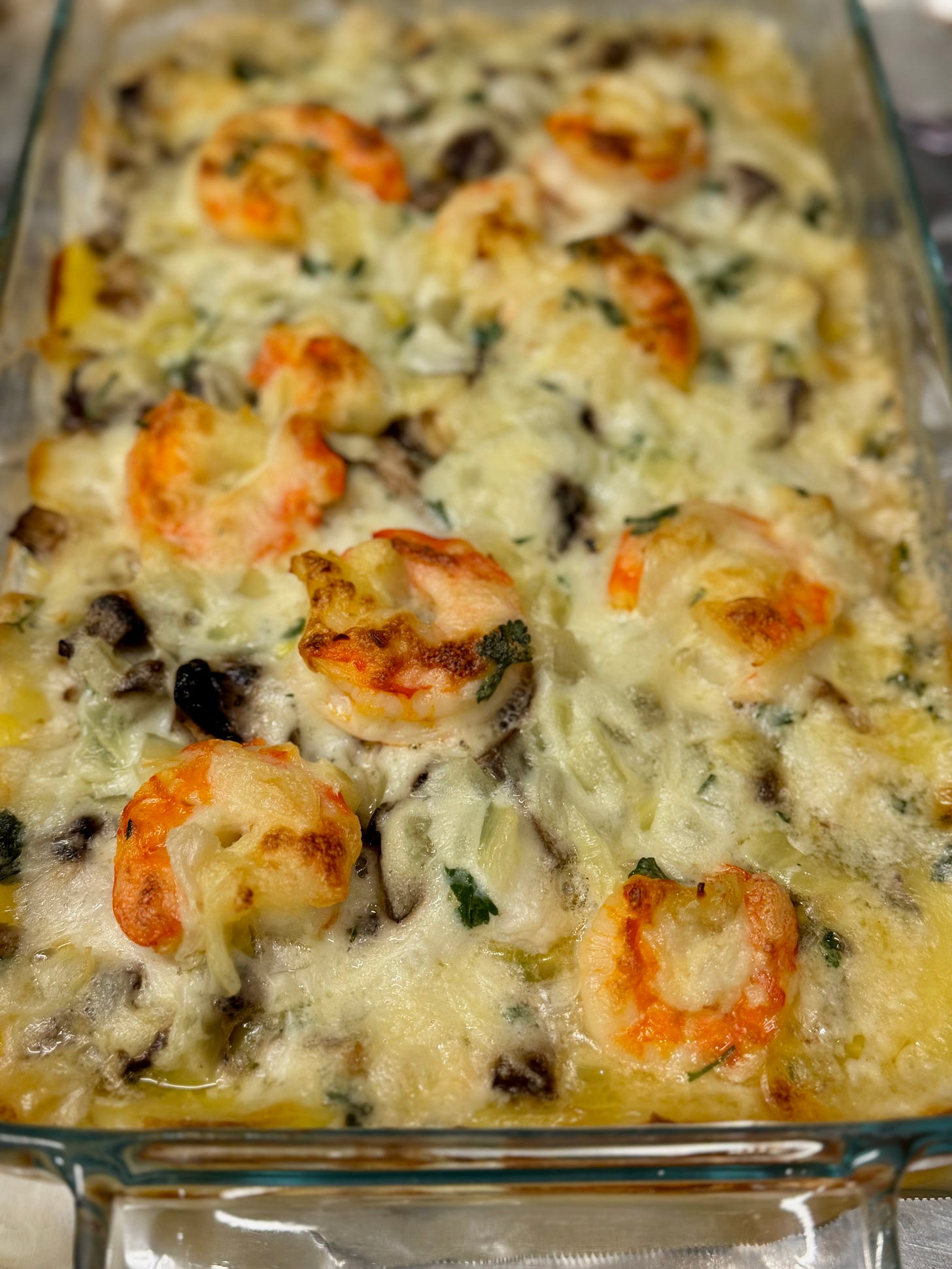 Cut fish fillets into bite-sized pieces and layer over the potatoes. Cover with washed and quartered mushrooms. Add shrimp on top. Pour the sauce evenly over everything, ensuring it filters through the layers. Brush any protruding potato edges with some of the sauce.