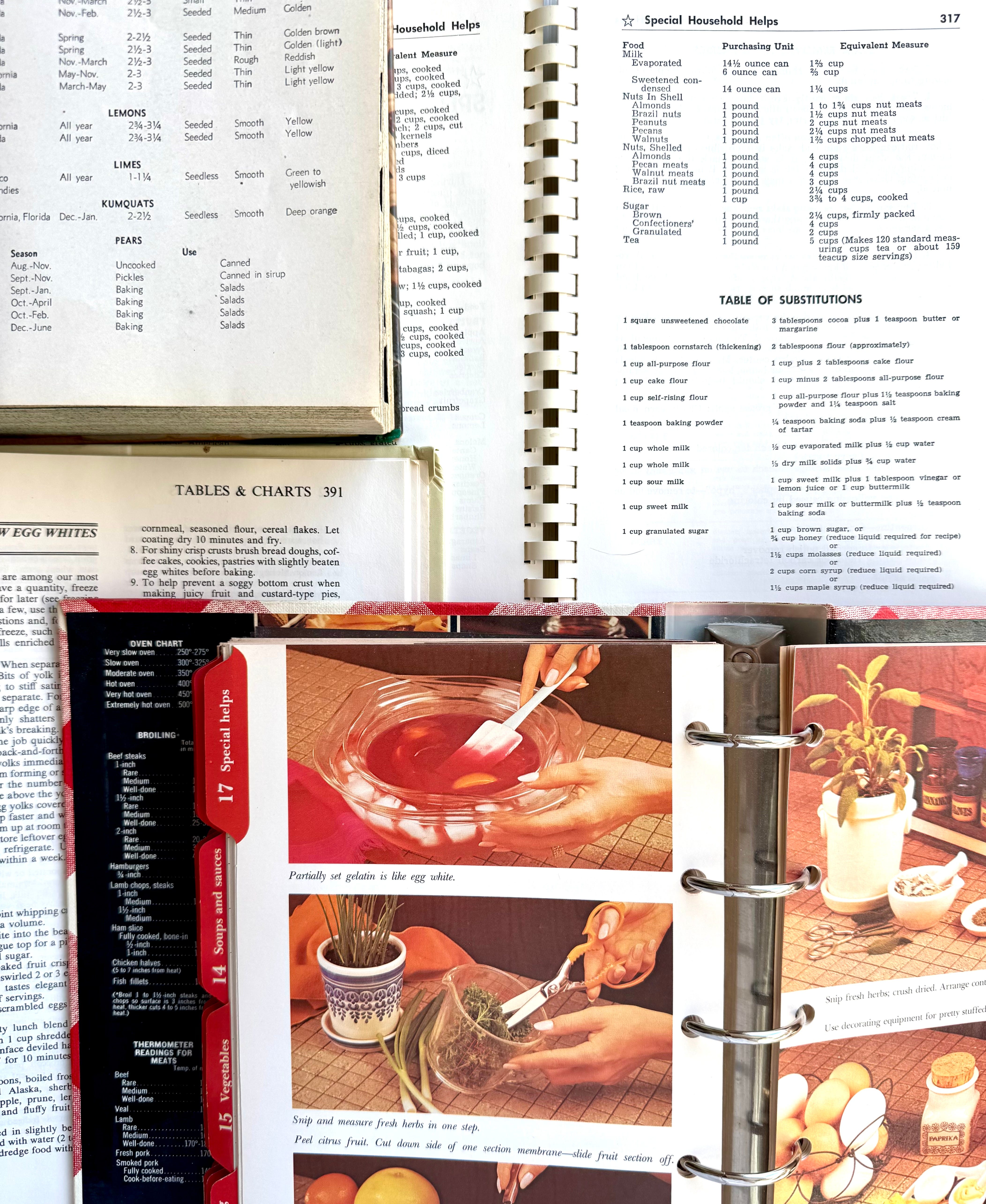 Most helpful of all, many featured before and after measurement charts, helping women managing busy households shop and plan wisely. If you knew that 3 whole medium-sized apples weighed 1 pound, and yielded 2¾ cups pared and diced or sliced apples, say, then you knew exactly how much to buy for an apple pie. While we turn to our phones for this handy advice, our mothers and grandmothers turned to their cookbooks for a rich world of information all at their fingertips.