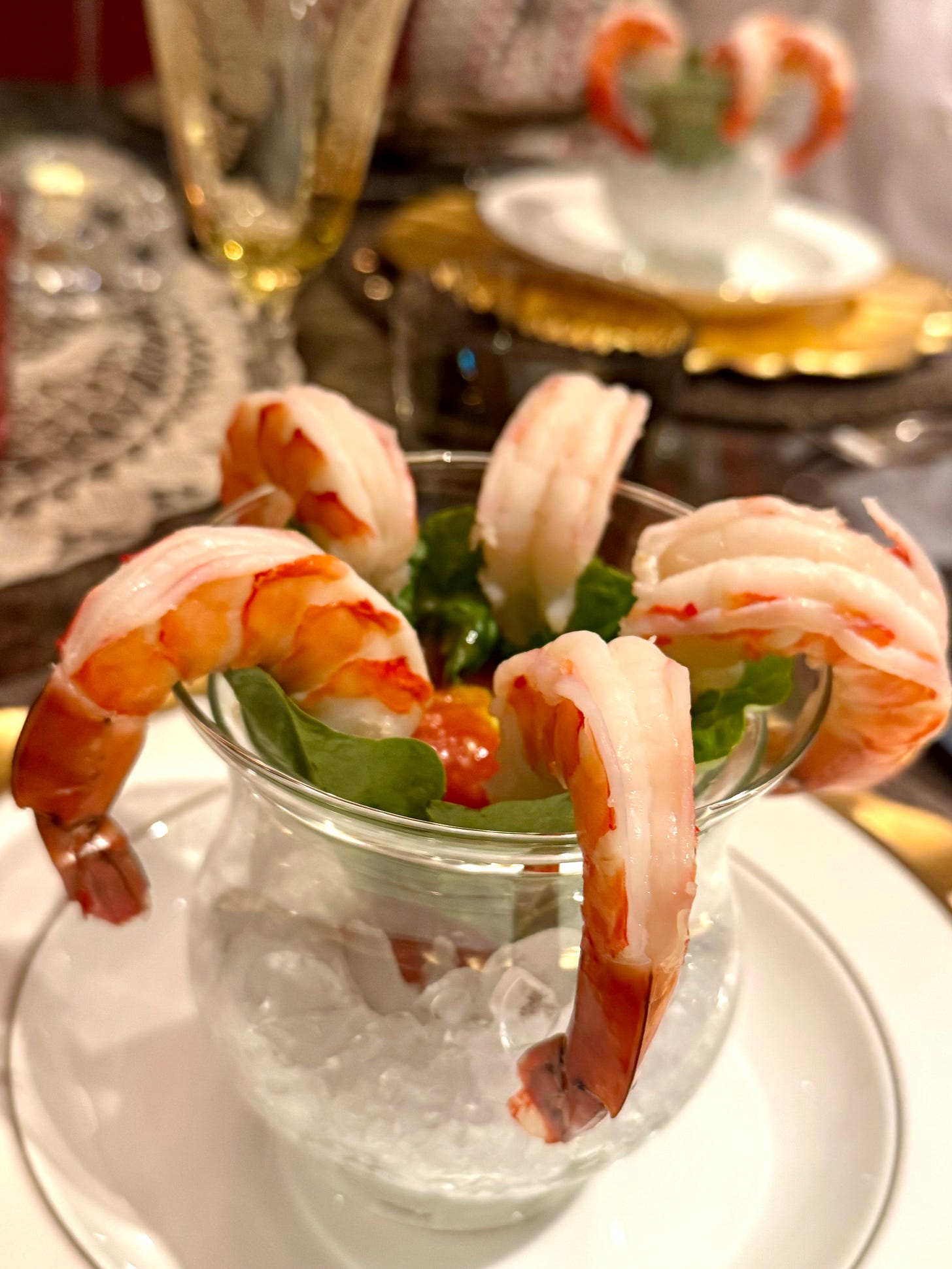 Sunday’s dinner was an old-school celebration of Mary Moore and both our mothers. We started with shrimp cocktail with Moore’s homemade cocktail sauce, using these beautiful vintage seafood cocktail glasses that belonged to my mother-in-law, Lise.