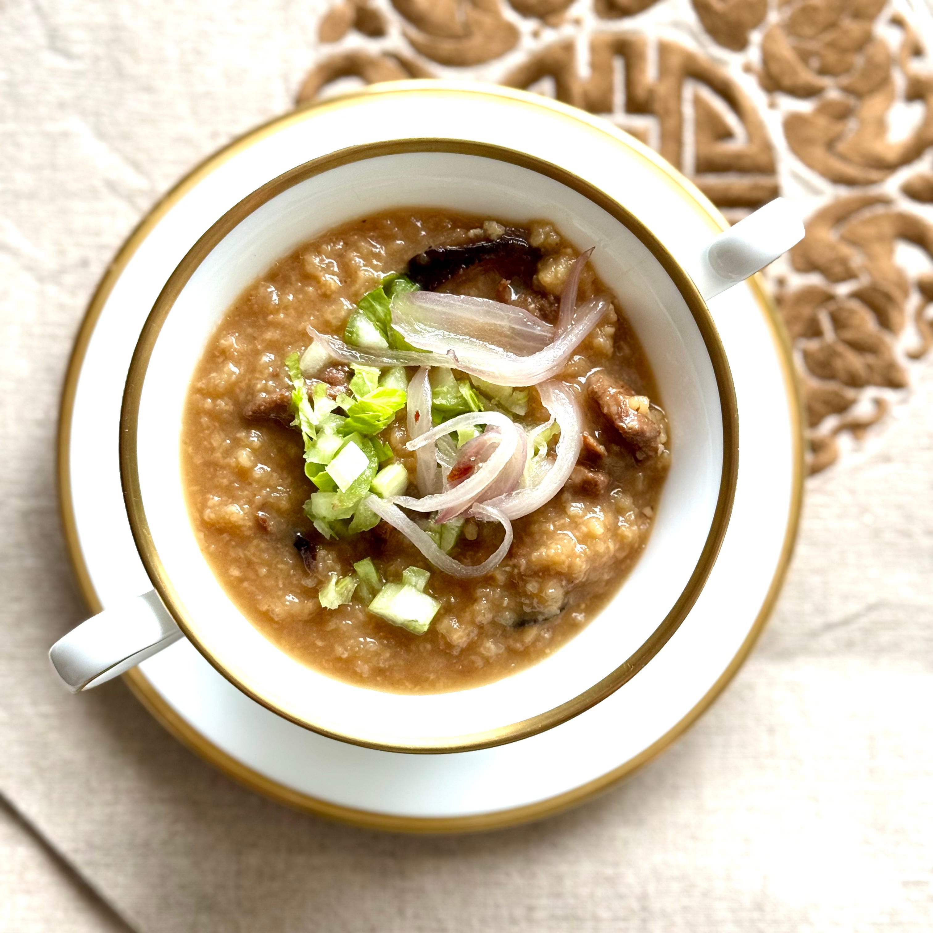Turn off the heat, and mix in the salt and white pepper, adding more if needed. To serve, ladle some congee into a bowl, garnish with a pinch of minced celery and fried shallots, and finish with a light drizzle of sesame oil.