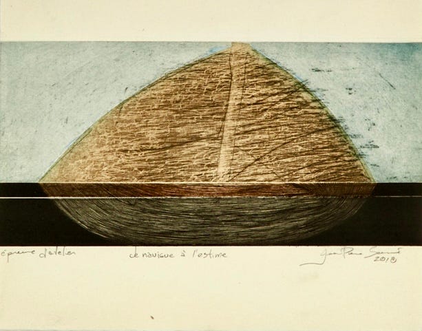 A l’estime is a French nautical term meaning navigation without precise instruments — relying on experience, judgment, and feeling. Sauvé’s piece above, Je navigue à l’estime, conveys the poetic sense of moving forward as interior, intuitive act, guided by perception and trust. The work suggests that creativity emerges in uncertainty—through attentiveness to what cannot be fully measured or known.